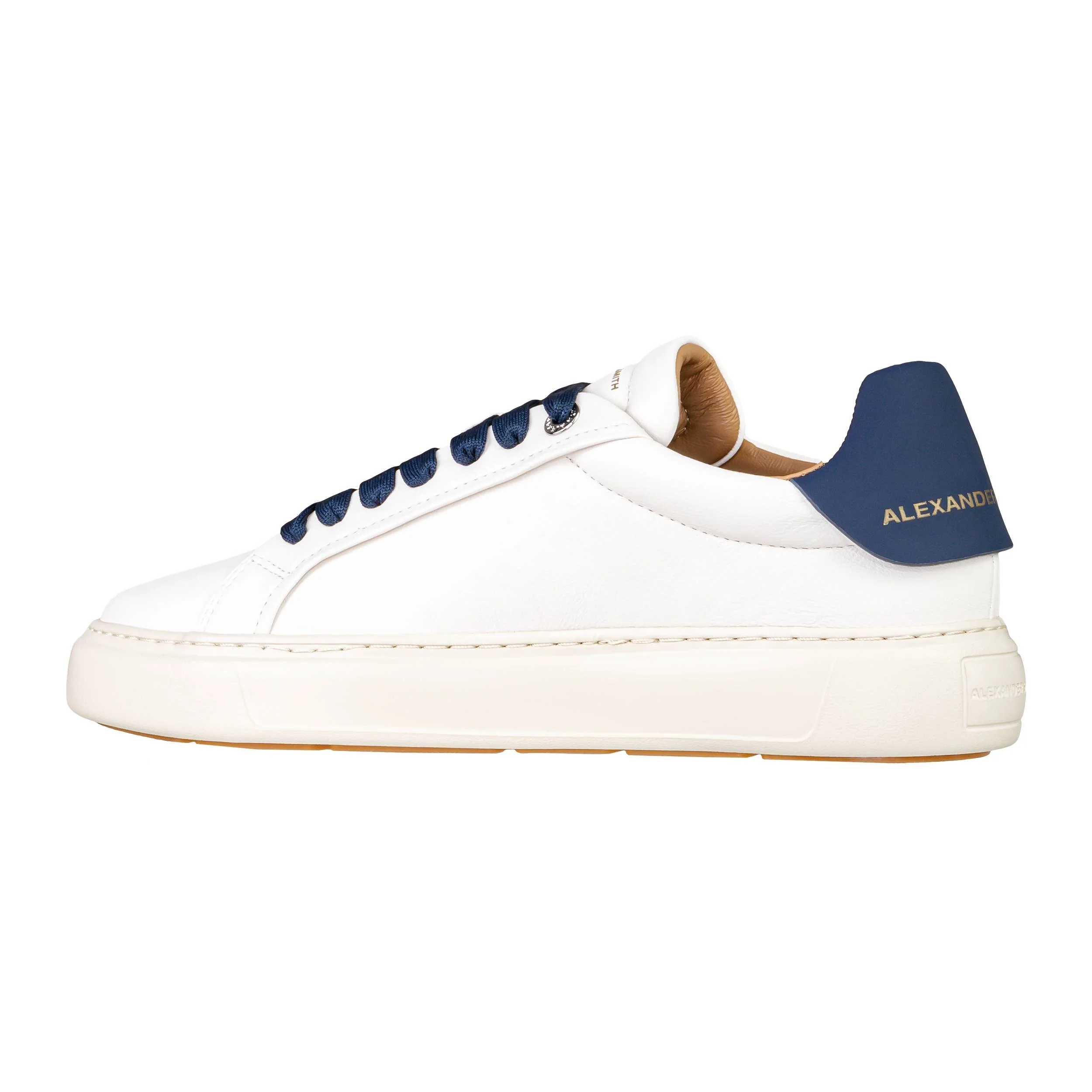 La sneaker Alexander Smith Soho Man White-Blue è una calzatura dal design contemporaneo che reinterpreta il concetto di scarpa sportiva in chiave luxury e urbana. La tomaia è realizzata in pregiata pelle bianca, caratterizzata da una silhouette pulita arricchita da inserti blu a contrasto sul tallone e sulla linguetta, che conferiscono un tocco di colore dinamico ed elegante. Sul lato esterno spicca il logo del brand con l'iconica rosa metallica, dettaglio distintivo che sottolinea l'attenzione per i particolari tipica della maison.