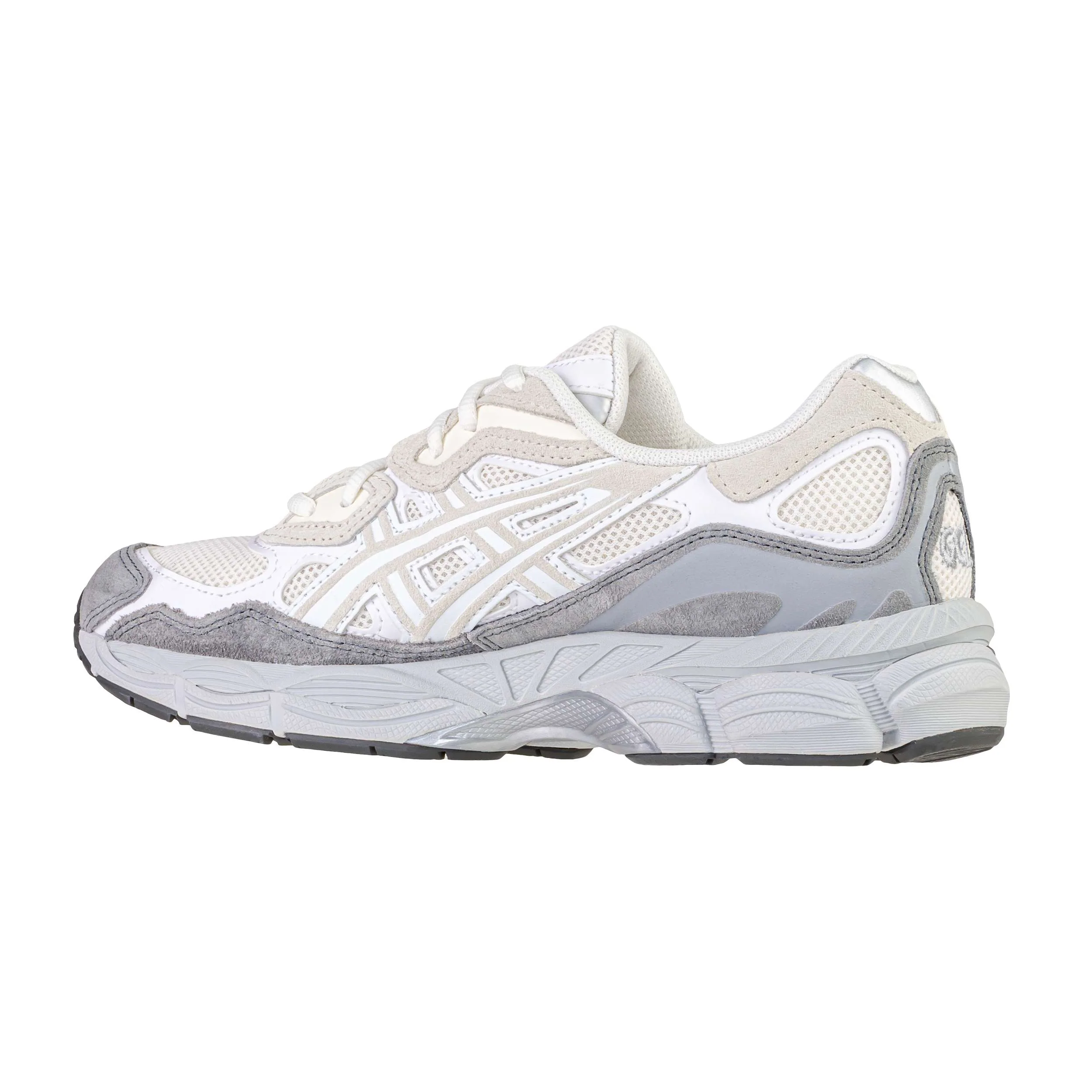 La Asics Gel-NYC nella colorazione Cream/White è una sneaker che fonde sapientemente il richiamo alla tradizione del brand con le più moderne tecnologie per il running. La tomaia è costruita con una base in mesh tecnico bianco che favorisce la traspirabilità, sovrastata da un sofisticato gioco di pannelli in pelle scamosciata color crema e inserti grigio fumo lungo la base e la punta. Le iconiche strisce laterali Asics sono realizzate in pelle bianca, armonizzandosi perfettamente con i toni neutri della scarpa.