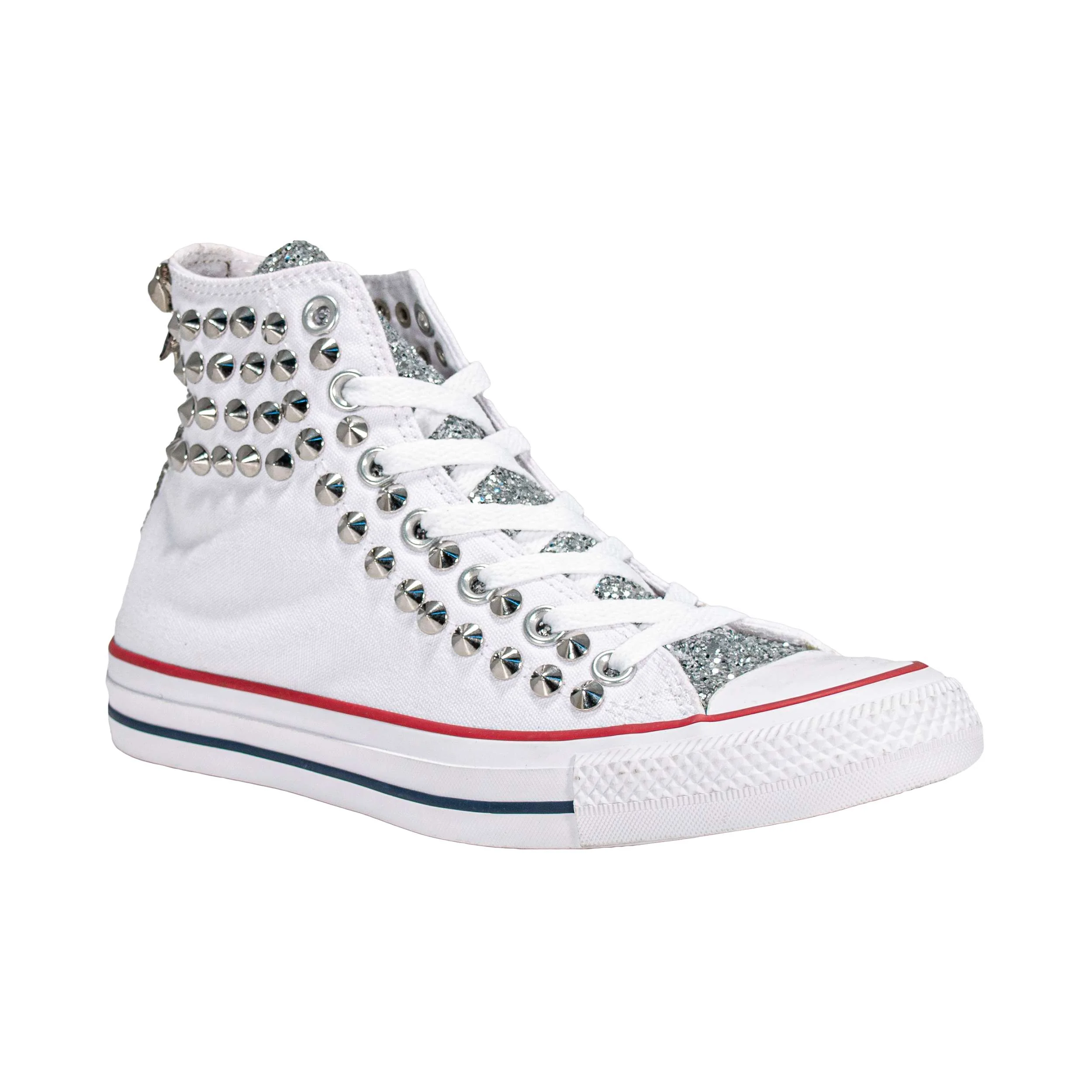 La scarpa sportiva più venduta di tutti i tempi. Questo modello viene ottenuto mediante l'applicazione di borchie e glitter argento sulla linguetta e sul dietro della scarpa.