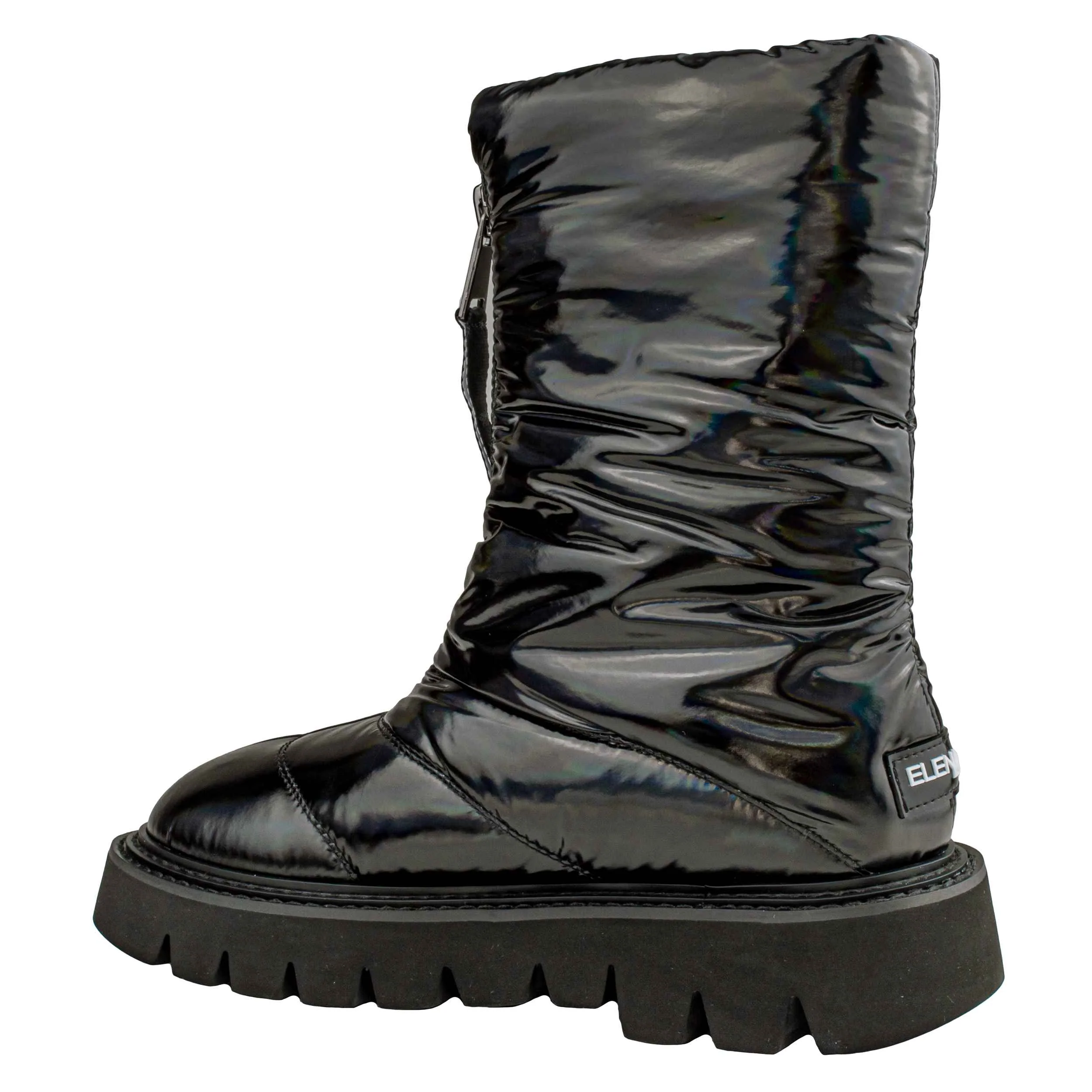 Polacco di ELENA IACHI realizzato in tessuto tecnico di colore nero lucido. Rigorosamente Made in Italy è caratterizzato da una tomaia imbottita stile doposcì con una cerniera sulla parte centrale alta sempre di colore oro. Il fondo oversize in stile carrarmato è in leggerissima gomma EVA di colore nero. Altezza tacco: 4 cm. Altezza gambale: 22cm. Collezione Autunno/Inverno 2021.